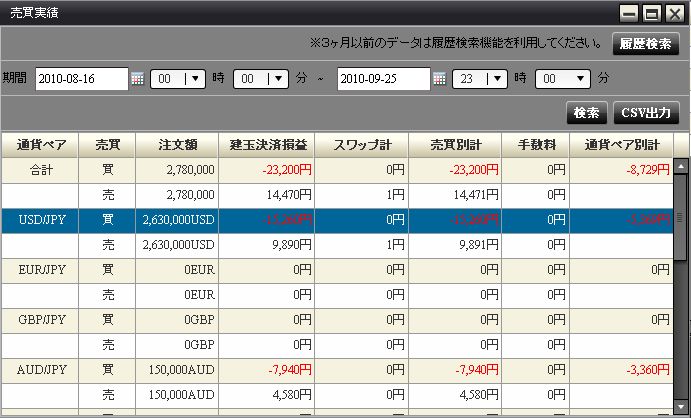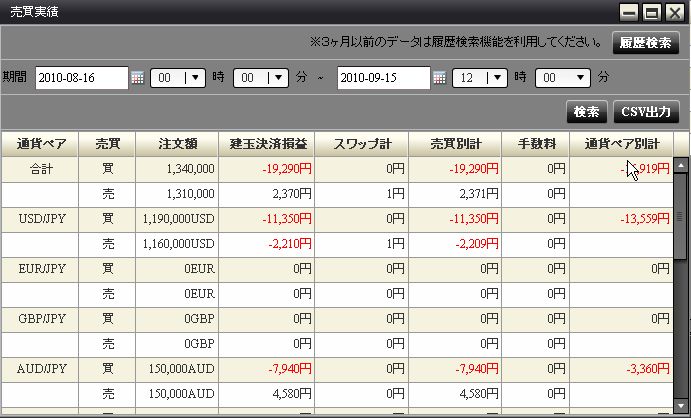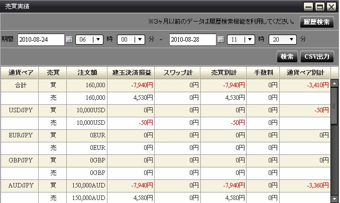 まず、介入直前までの売買実績です。10万円の資金からのトレードですから、合計金額を見てもらうと解かります。当然そのときまでマイナス。